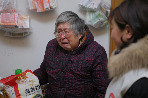 家住顶楼的田大娘是独居空巢老人,子女长年不在家,见到这么多志愿者上门,并且还带了慰问品,田大娘激动的直流眼泪,跟大家更是有说不完的话。田大娘患有卵巢癌,现在长期服药,药品在墙上挂的满满当当,妇儿堂医院护士贴心的为田大娘测量了血压,并叮嘱其日常注意事项。临走时田大娘执意出门相送,舍不得志愿者们的离开。